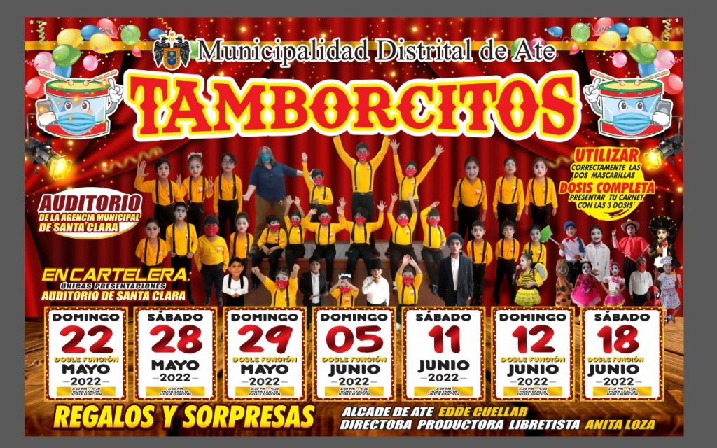 Anita Loza se encuentra muy agradecida con el Alcalde de Ate, Edde Cuéllar, quien la apoyo incondicionalmente en la realización del espectáculo musical “Tamborcitos”, que toda la familia no debe perderse las diferentes funciones que se realizarán sábados 11 y 18 de junio a las 3:30 pm, domingos 5 y 12 de junio en doble función 3:30 y 4 :30 pm en el tercer piso de la Auditorio de la Agencia Municipal de Santa Clara, ingreso libre. ¿Te lo vas a perder?