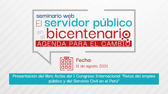 “El servidor público en el Bicentenario – Agenda para el cambio” es el nombre del seminario web, que la Autoridad Nacional del Servicio Civil (SERVIR) ha organizado, para este miércoles 11 de agosto a las 5 p. m., en la que también se presentará el Libro de Actas del I Congreso Internacional «Retos del empleo público y del servicio civil en el Perú».