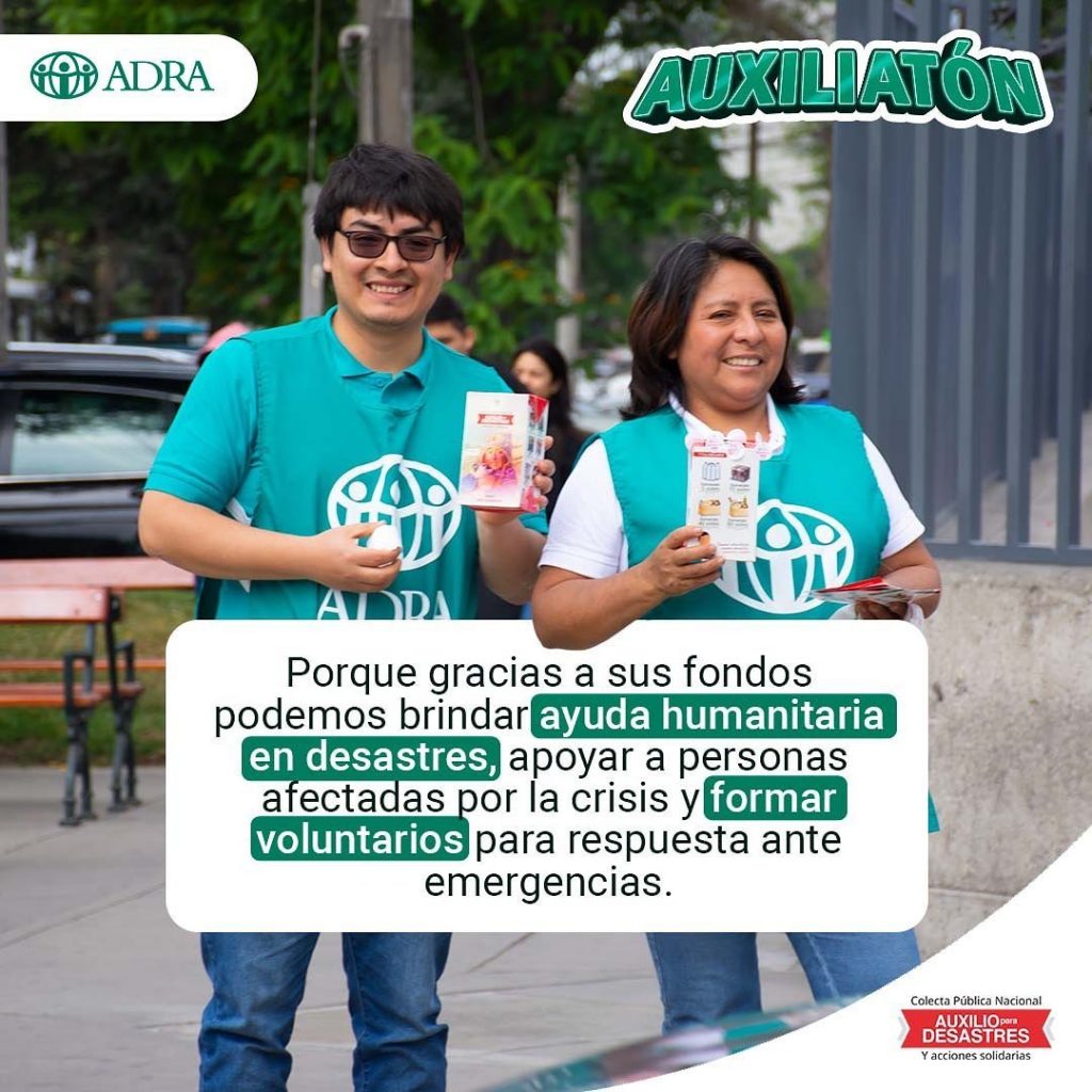 ADRA PERÚ a través de la AUXILIATÓN busca estar preparada para poder atender a la población en caso de emergencia cuando ocurra algún desastre, como sismos, huaycos, inundaciones, deslizamientos, entre otros. En caso de que no suceda alguna emergencia durante el año, realizan acciones solidarias entregando kits de alimentos, cocina, abrigo, dependiendo la necesidad de la zona de impacto en el país.