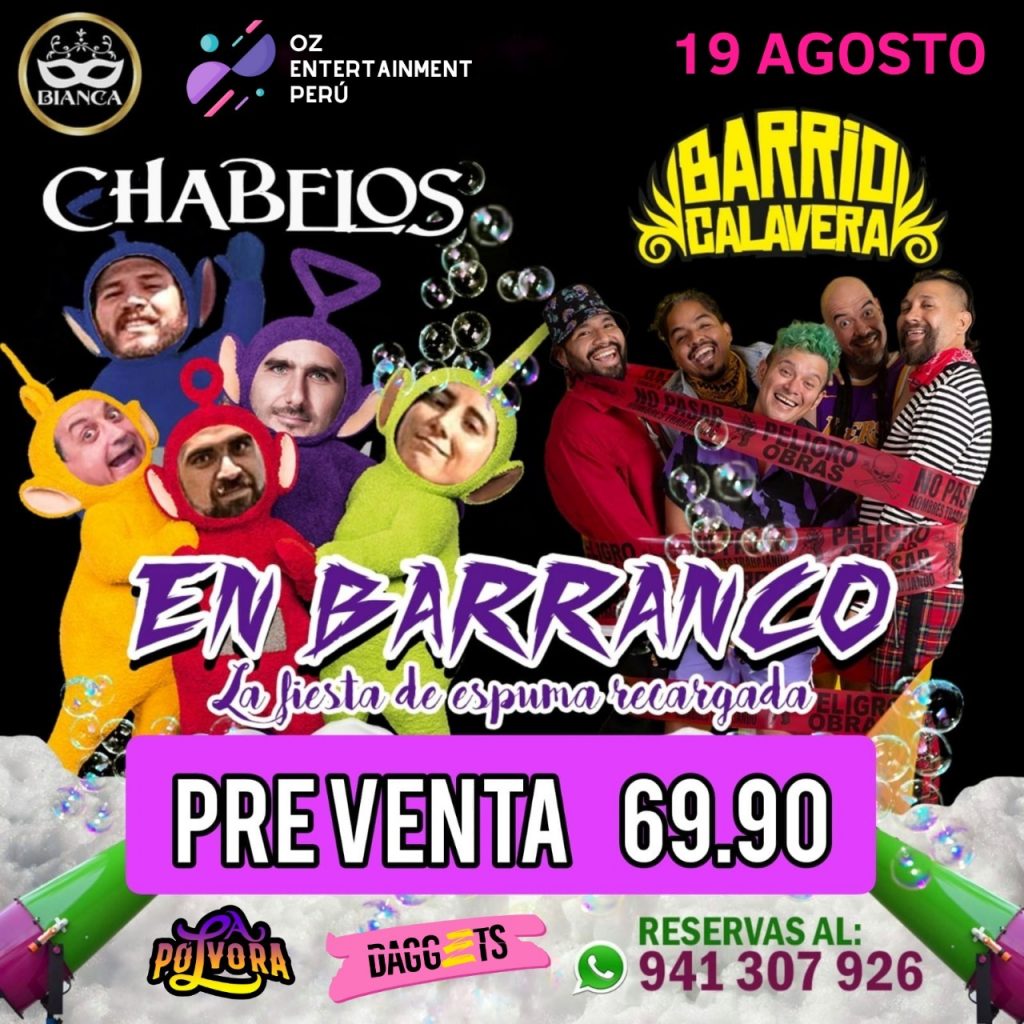 OZ Entertainment Perú anuncia su nuevo evento que la exitosa banda “Chabelos” regresan al Centro de Convenciones Bianca junto a los integrantes de Barrio Calavera titulado “La fiesta de la espuma recargada” a las 9 de la noche y con una atractiva pre venta. Entradas a la venta en Joinnus.com