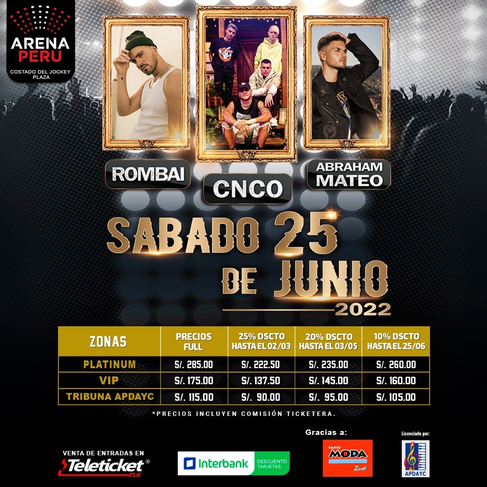 Se confirmó la llegada de CNCO, Rombai y Abrahm Mateo para la celebración de una de las fiestas más esperadas por los amantes del género latin pop y urbano. La cita será este 25 de junio, en el Arena Perú (costado del Jockey Plaza). Las entradas están disponibles, a través de Teleticket, con descuentos del 25% hasta el 2 de marzo.