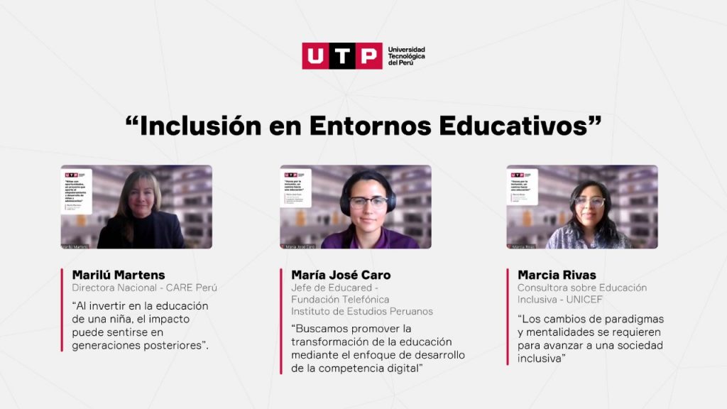 La educación inclusiva plantea atender las necesidades de todas y todos, repercutiendo positivamente en diversos ámbitos del país. Por ello, en el congreso “Inclusión en entornos educativos”, organizado por la Universidad Tecnológica del Perú (UTP), se compartieron experiencias y herramientas que promueven una educación inclusiva desde diferentes perspectivas.