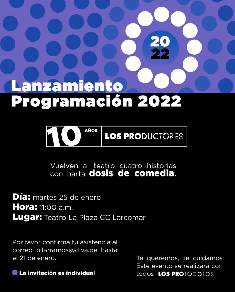 El lanzamiento oficial de la programación se realizará el próximo martes 25 de enero a las 11 am, de manera presencial en Teatro La Plaza (Larcomar). Se hará memoria de lo que ha sido está primera década de LOS PRODUCTORES y a manera de un late show, Christian Ysla irá presentando a varios de los artistas de las obras a presentarse en este año tan especial. El público podrá verlo ese mismo día a las 8pm en que será transmitido por las redes de Los Productores y La Plaza.