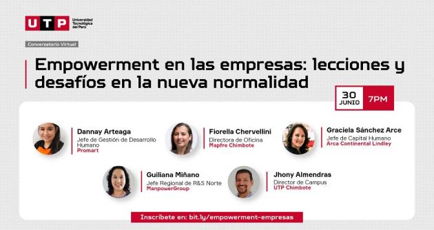 Para tratar este tema, la Universidad Tecnológica del Perú (UTP) realizará el conversatorio virtual gratuito “Empowerment en las empresas: lecciones y desafíos en la nueva normalidad”. El evento se llevará a cabo, vía Zoom, el miércoles 30 de junio a las 7 p. m.