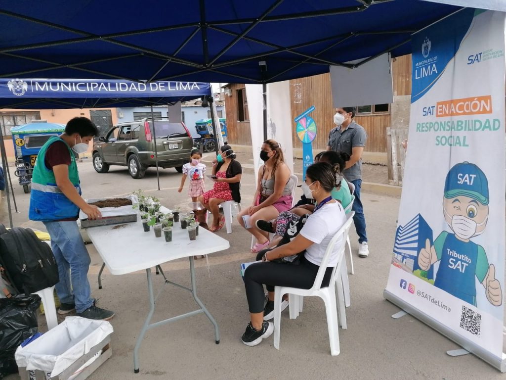 Lima, 3 de marzo del 2022.- El Servicio de Administración Tributaria (SAT) de Lima donó material reciclado que fue usado en talleres de biohuertos y compostaje en los que participaron vecinas de ollas comunes de Chorrillos, el Rímac, Pucusana, Villa El Salvador, Pachacámac y Villa María del Triunfo durante febrero.