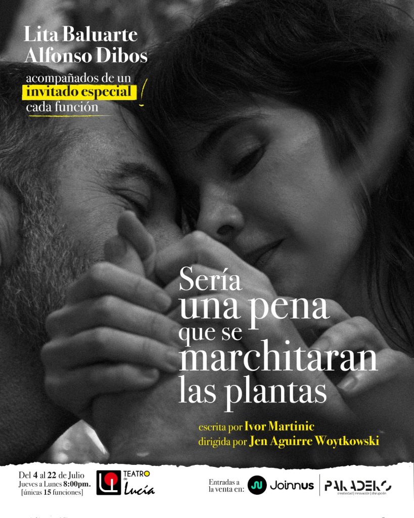 «Sería una pena que se marchitaran las plantas», una obra de teatro innovadora, de estructura abierta, que completa su creación en vivo, mientras se representa, se estrena el próximo 4 de julio en el Teatro de Lucía, bajo la dirección de Jennifer Aguirre Woytkowski con las actuaciones principales de Lita Baluarte y Alfonso Dibos. La obra escrita por el autor croata Ivor Martinic, se modifica en cada función convirtiéndose en una experiencia nueva y única, cada vez.